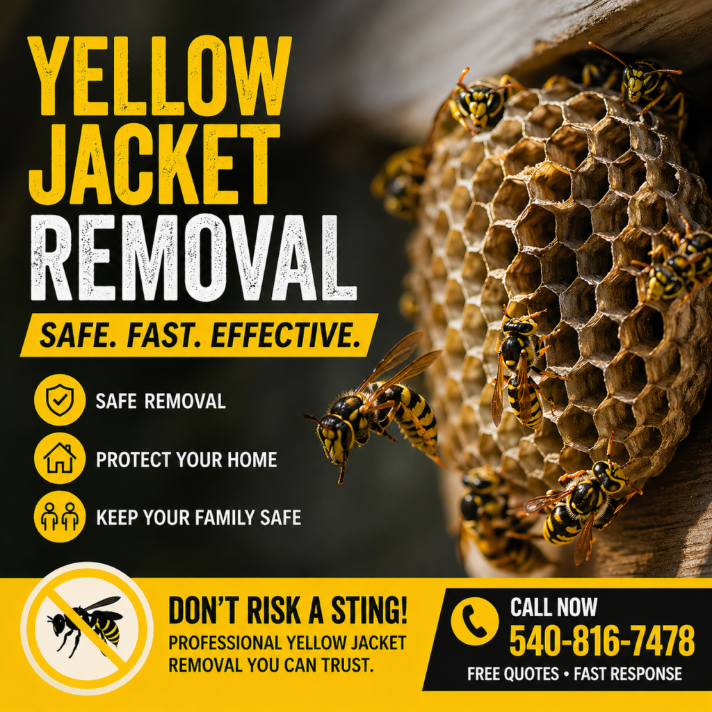 Fast local yellow jacket nest removal for Moneta, Smith Mountain Lake, Bedford, and nearby areas. We help with active ground nests, yard nests, and problem outdoor areas. Call or text 540-816-7478 today for prompt service.